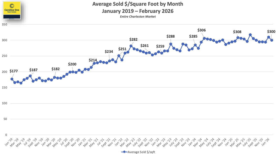 The average sold price per square foot is holding strong at $300/sqft, near all-time highs. Because the median sale price is stable but the price-per-foot is creeping up, it tells us that consumers are opting for smaller homes to keep their monthly payments manageable. Even with a stable “sticker price,” homes in Charleston are continuing to appreciate.